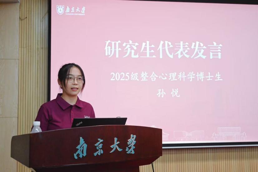 研究生代表、2025级整合心理科学博士生孙悦同学分享了自己站在新的学术起点的无限感慨。面对各类时代议题,社院人应当更加具有使命感:回应新技术带来的新挑战,既要兼顾脚踏实地的学术原则,也要秉持与时代同舟共济的决心。她提出,坚守初心,勇敢地去做“重要的事”与新生们共勉。