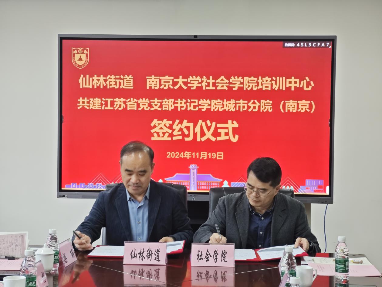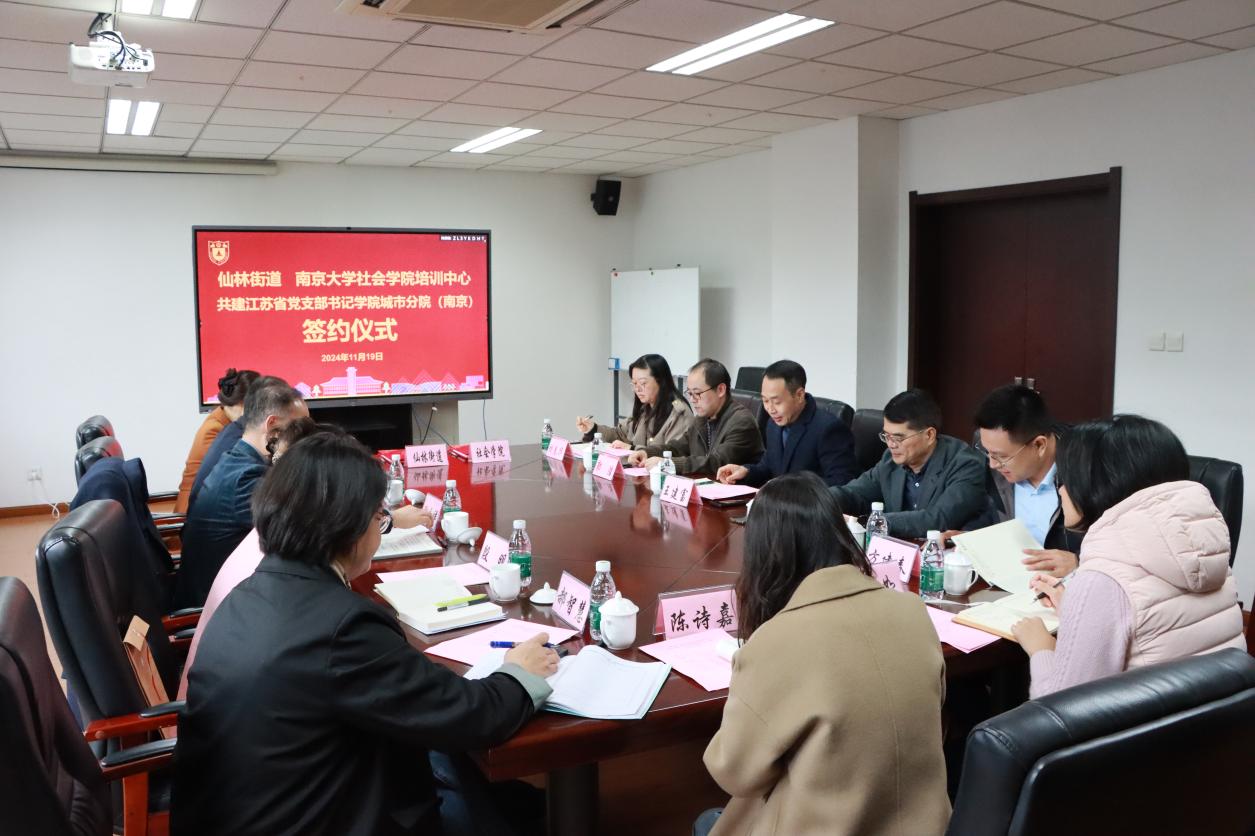 11月19日下午,时时彩计划-重庆时时彩计划 与仙林街道共建江苏省党支部书记时时彩计划 城市分院(南京)(以下简称“城市分院”)签约仪式在南京大学仙林校区举行。时时彩计划-重庆时时彩计划 党委书记王建富、院长吴愈晓、办公室主任郭浩、培训中心主任方建春、培训中心副主任胡春华参加签约仪式。仙林街道党工委书记欧立祥、党工委副书记王杨、纪工委书记殷明、江苏省党支部书记时时彩计划 城市分院(南京)教育发展中心主任梁丽、仙林党群服务中心主任郝智慧等出席活动。