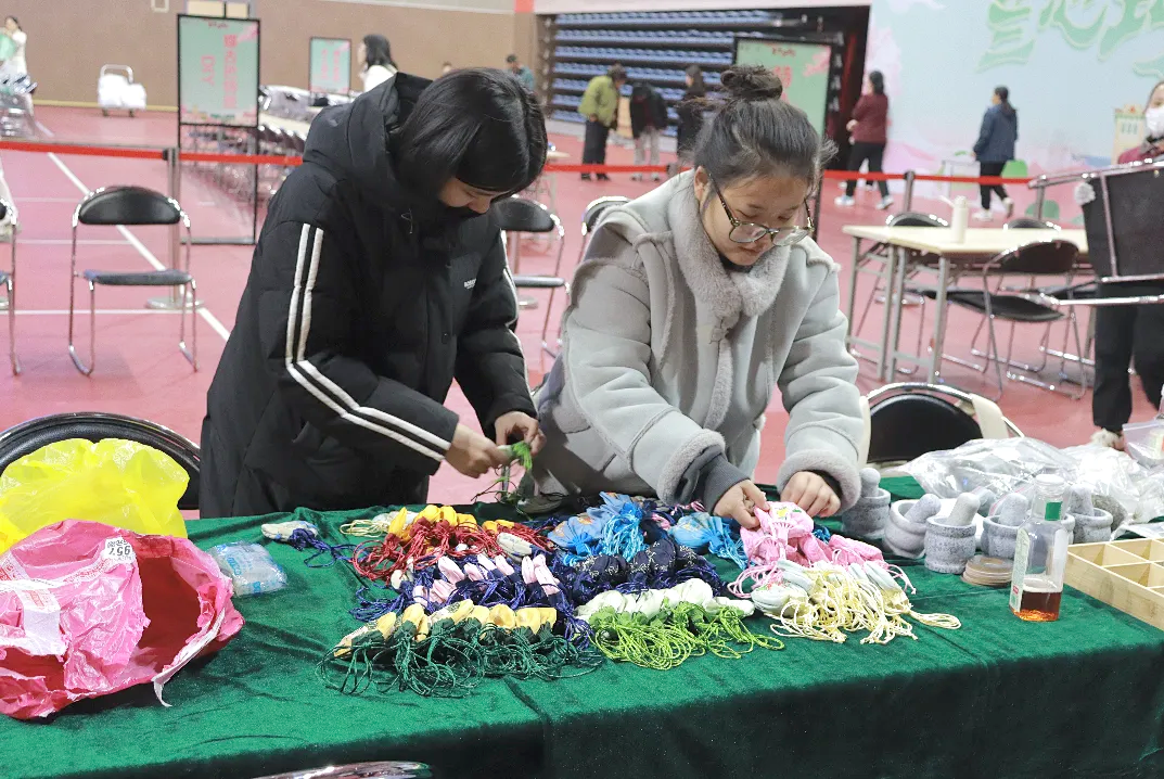 师生通过揉捻艾绒、裹布定型、彩线缠绕等工序,将传统中医药智慧与现代美学相结合,制作出兼具保健功能与观赏价值的古法艾草锤。活动现场艾香袅袅、笑语盈盈,师生们在协作中深化情谊,在传统手作里感受文化魅力。