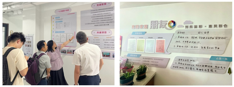 8月13日下午,调研组赴堰桥街道参观刘仓社区惠韵家园小区和刘仓社区居委会,并与堰桥街道社工条线负责人以及刘仓社区两委班子进行座谈。调研组围绕“双百计划”(百个支部进小区、百个小区建支部)、城市社区治理力量整合、社志融合(专业社工+志愿服务)模式等议题进行了调研。随后,调研组走访集宿区(外来人口集中住宿区),集宿区主要面向外来就业群体,由民营企业负责运营,打造优质的居住服务,是惠山区打造的新就业群体友好场景。